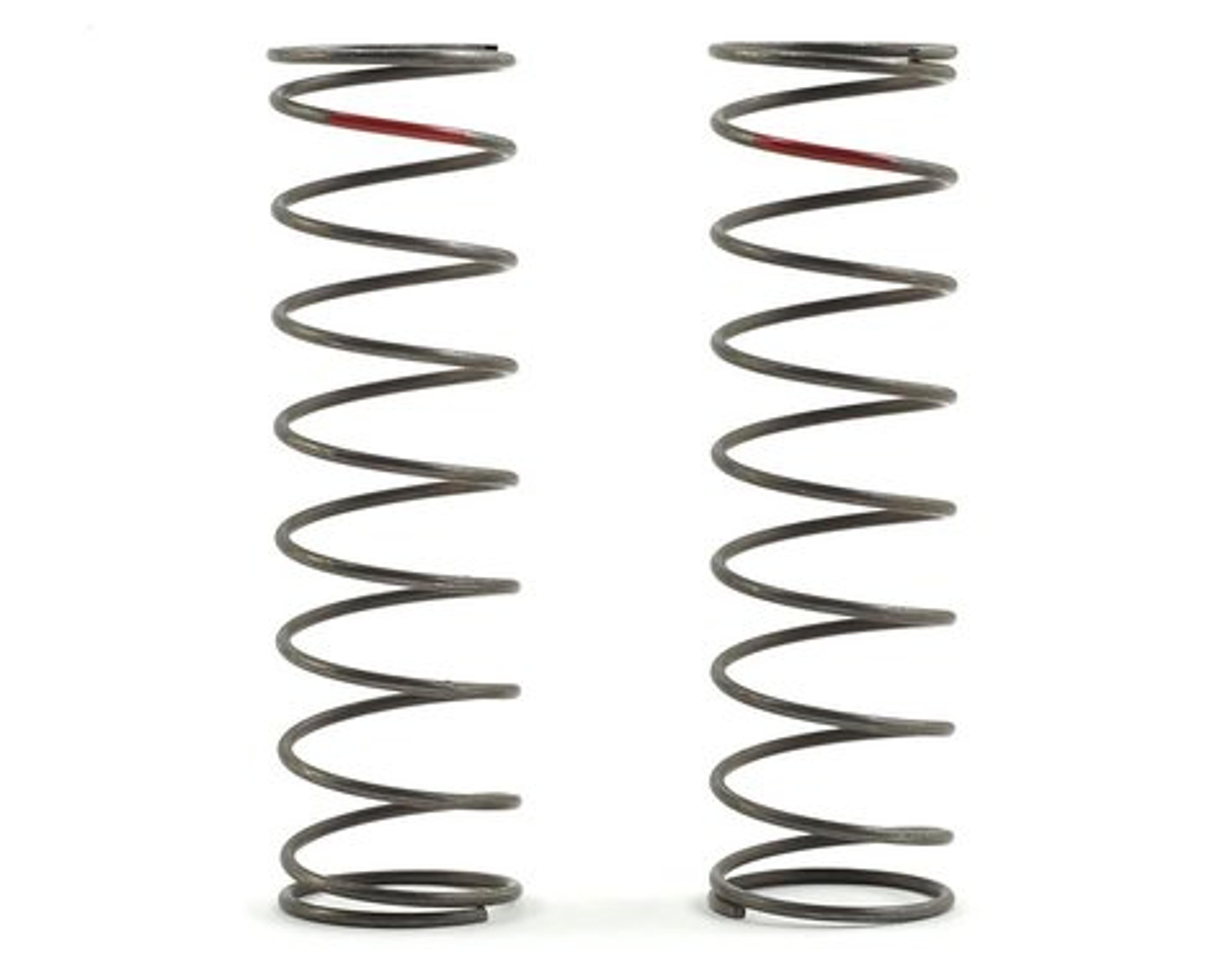 TLR 16mm EVO Rear Shock Spring. EVO shock springs are closer together in rate for finer tuning. They are also constant in coil diameter and longer length when compared to the standard TLR springs. Between the constant coil diameter and the frequency TLR has chosen for these, these handle much better in all conditions, especially when it comes to bumps and landing. These are the red, 3.8 rate rear springs.