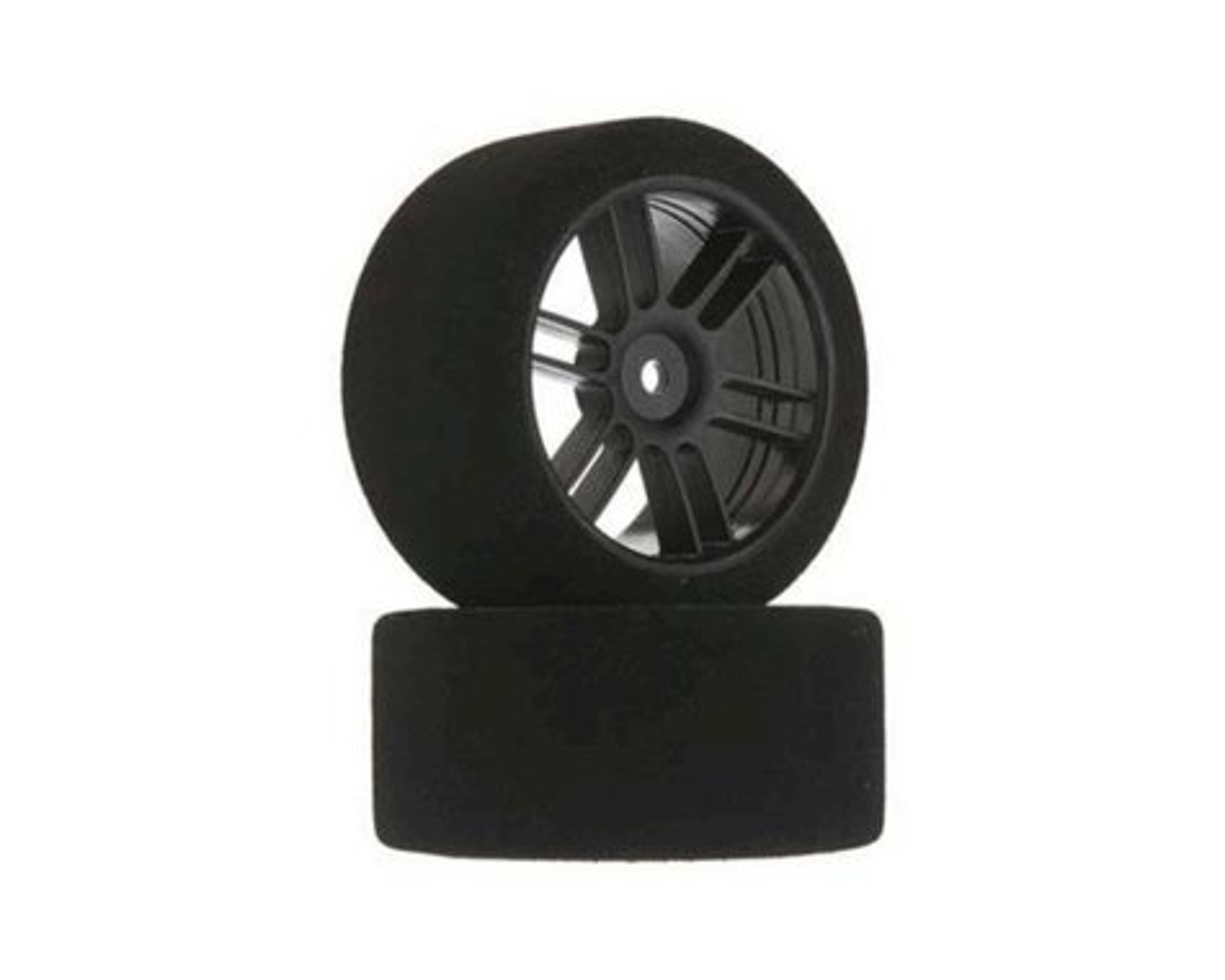 John's BSR Touring Car Foam Tires. 45mm wide, 68mm diameter, 30 shore tires, Pre-Mounted on black spoke wheels. Package includes two tires.