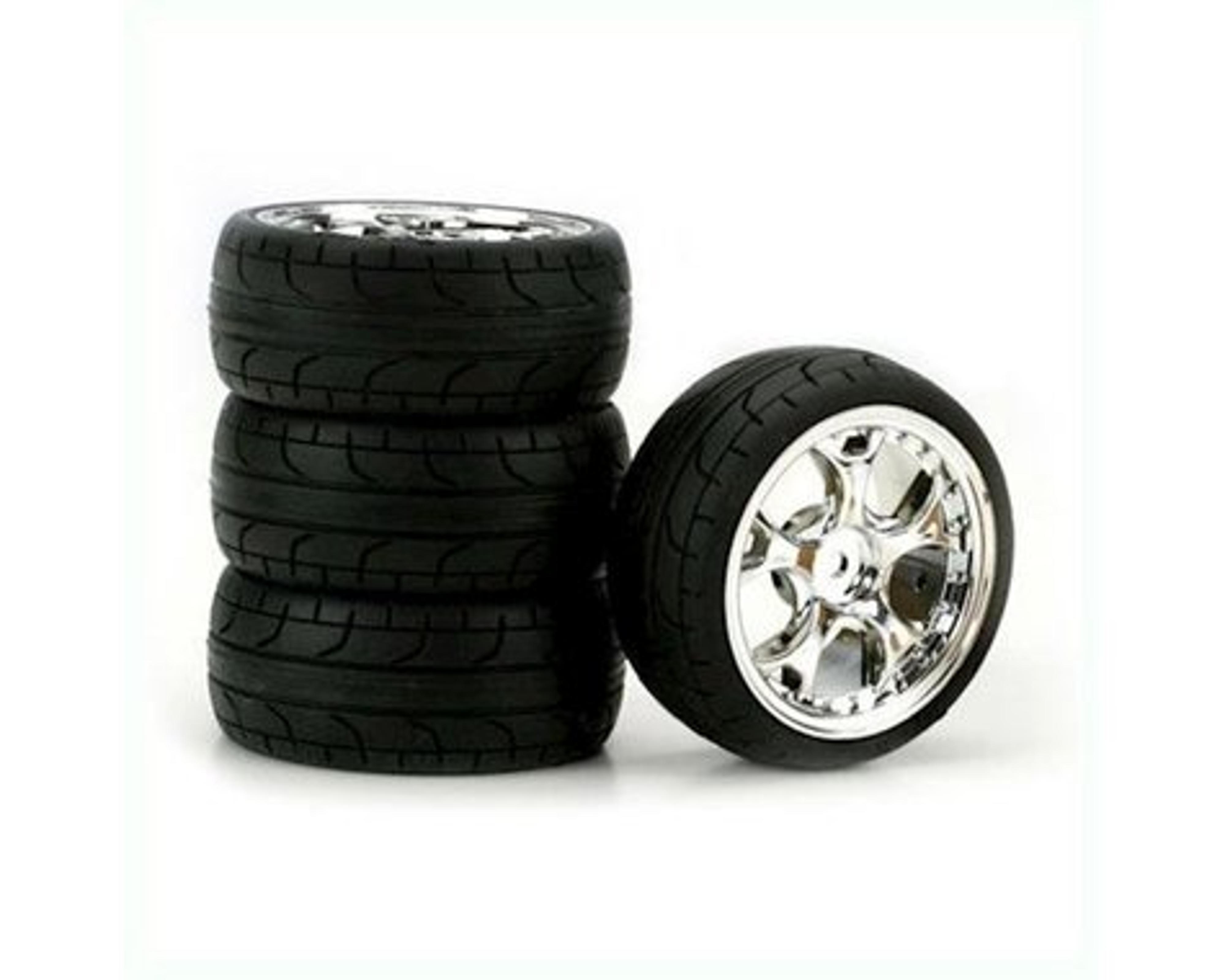 This is a pack of four DuraTrax ST Radial 1/10 Scale Tires pre-mounted on 5-Blade Chrome Wheels. These tires are mounted and ready to go, with a 12mm hex for easy fitment on the front or rear of your TC car.
