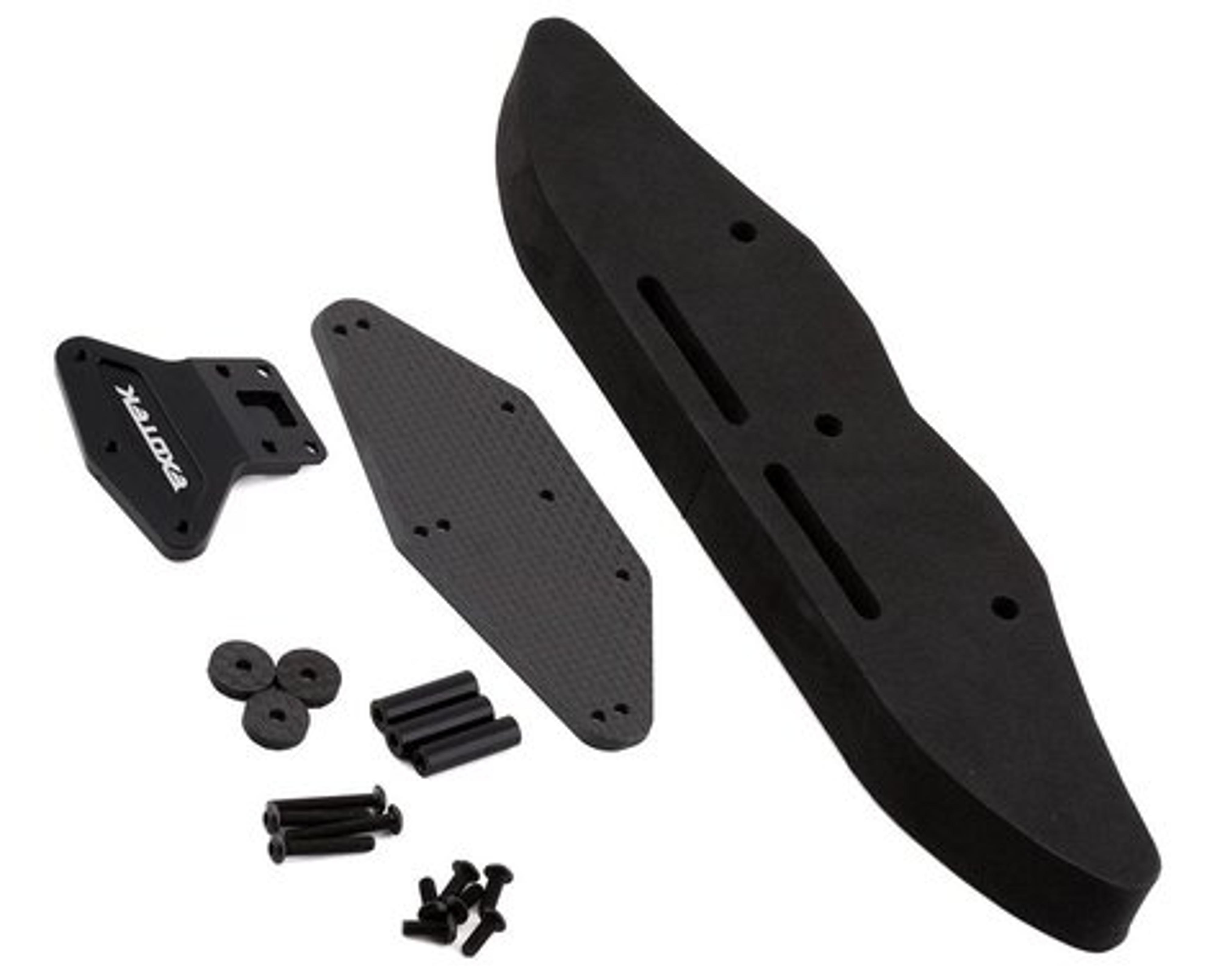 The bumper features an aluminum and carbon fiber mounting base that secures the extra wide high density foam bumper. The bumper itself is made from the same high impact foam used in touring car racing. Inside the foam bumper are 3 alloy posts for extra secure foam bumper mounting. The carbon plate has 2 hole positions for mounting the foam forward or back.