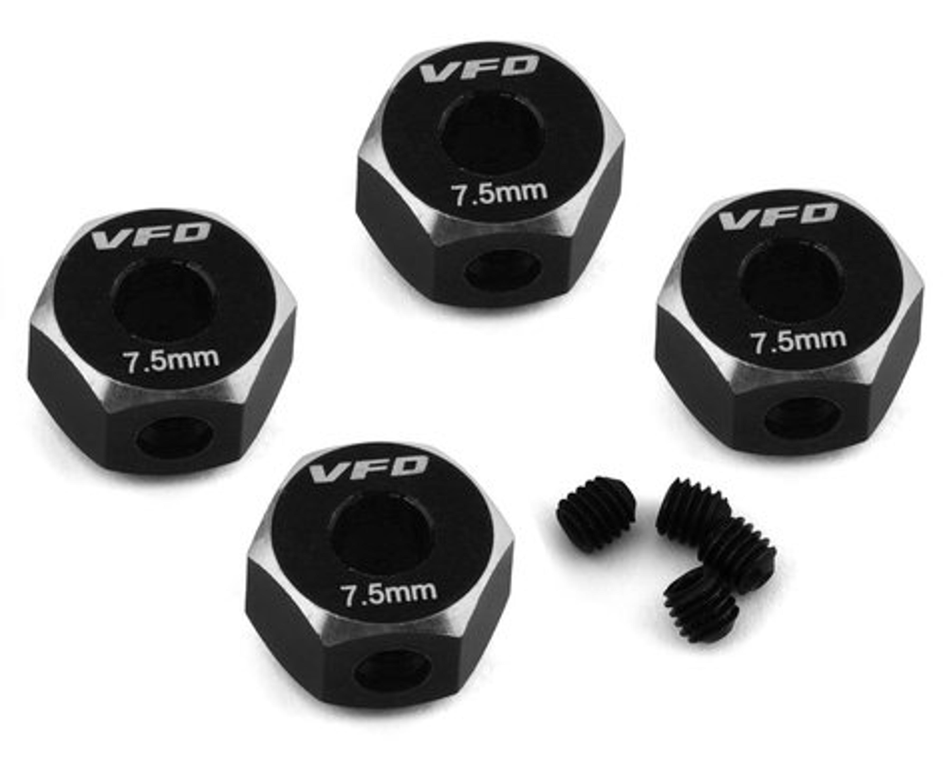 V-Force 12mm Hex Adapters are an excellent upgrade for Team Associated based applications. These hex adapters are available in 5.5, 6, 7.5 and 8.5mm widths and allow a wider range of rear track width tuning options. The hexes feature a deep set pin slot that allows you to place the hex adapter farther over the CVD axle pin to reduce unwanted rear axle play. The back side of the hexes have been machined to reduce overall weight and a bright anodized finish with laser etched markings make identification easy.